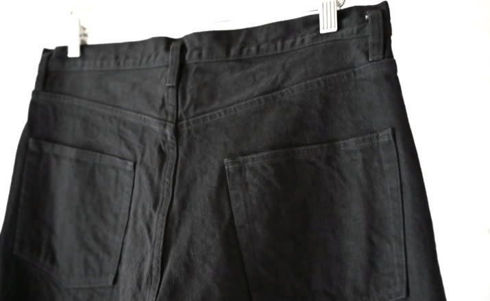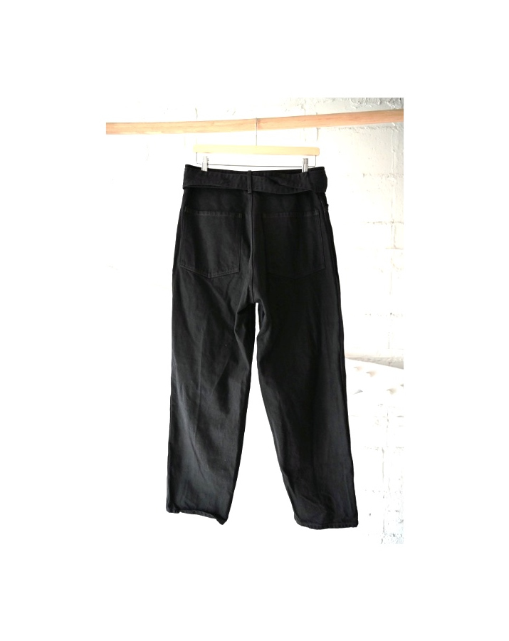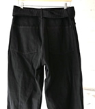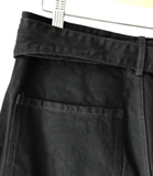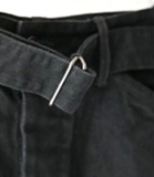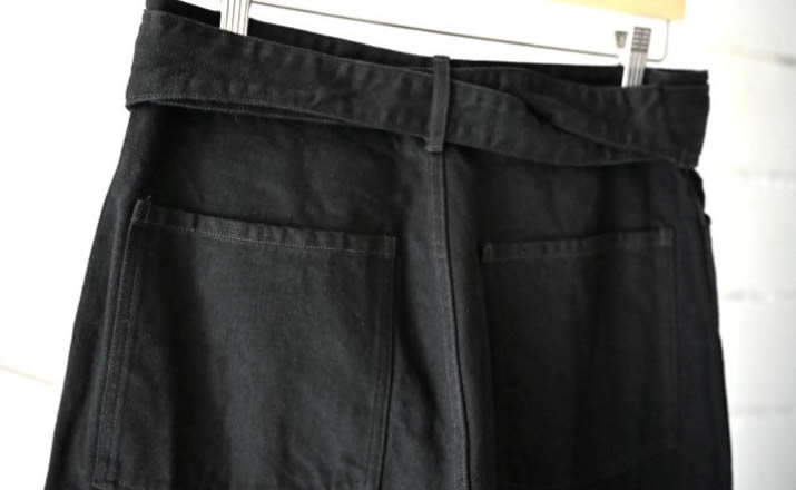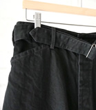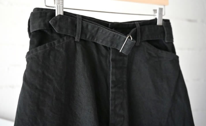 中白のブラックデニムで作成した定番のベルテッドパンツ。